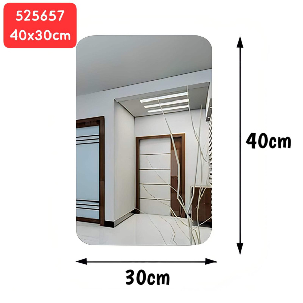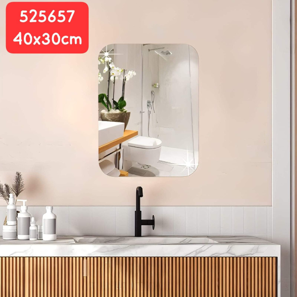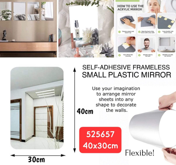 مراية بلاستيك سميكة وبنفس الوقت عندها مرونة حجم وسط قياس ٤٠×٣٠ سنتم بتتلزق على اي حيط او سطح ناعم ونظيف.