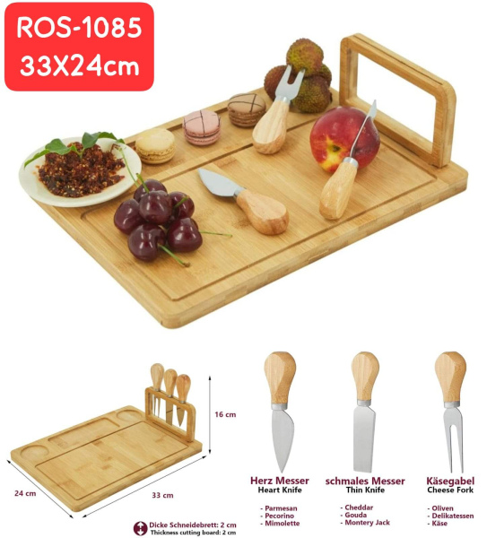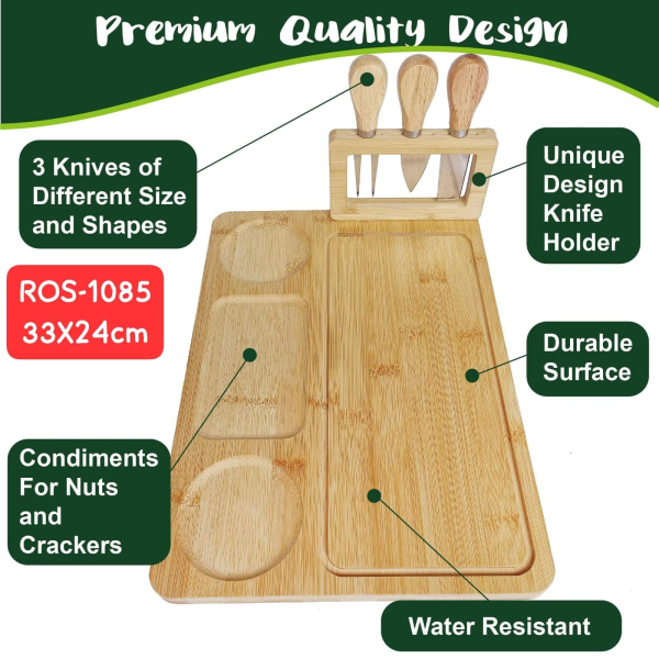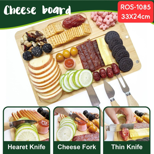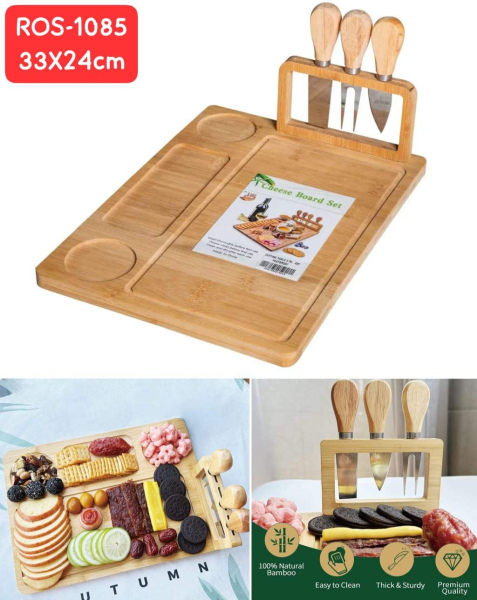 لوح خشب بامبو طبيعي سميك ومرتب مع حراف ناعمة ونظيفة بدون نثرات مؤذية، مع قاعدة قابلة للفصل بتحمل سكين وشوكة ومشحاف تقطيع.