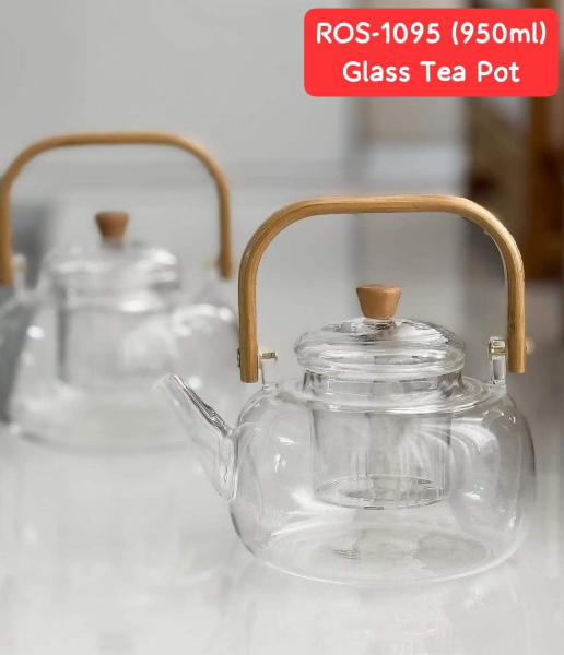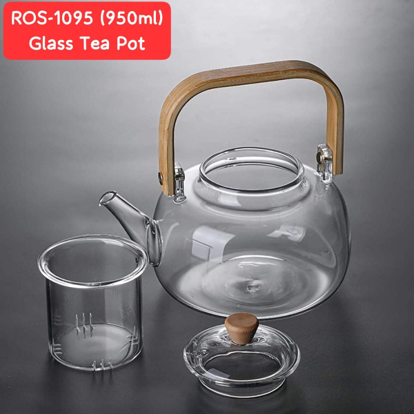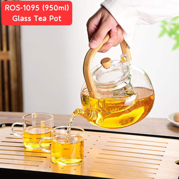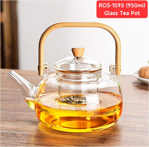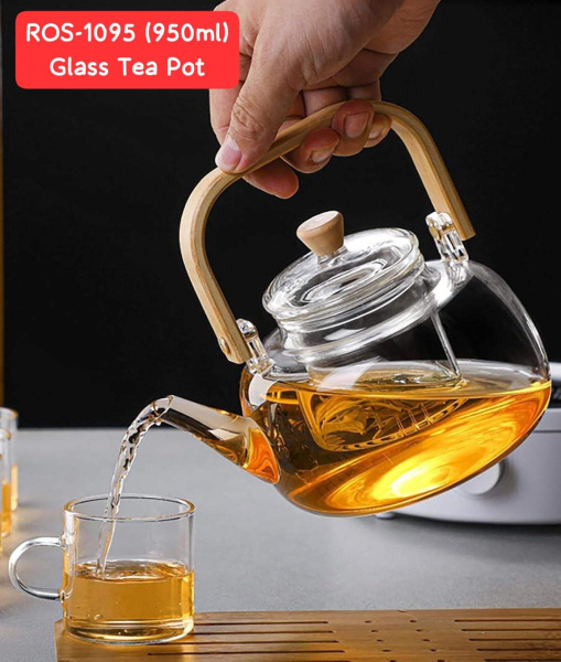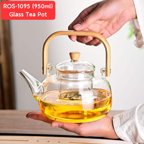 950ml Glass Tea Pot With Filter and Wooden Handle.