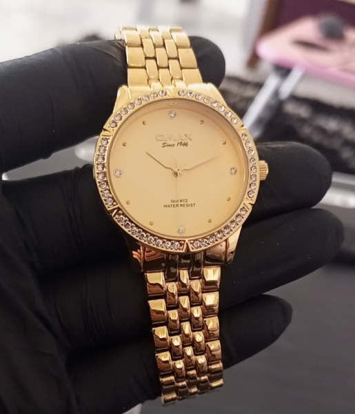 تتألّق هذه الساعة بتصميمٍ ذهبيٍّ راقٍ يمنح معصمك لمسة من الفخامة الهادئة. يحيط بالإطار صفٌّ من الفصوص اللامعة التي تزيدها بريقًا وأناقة، فيما يأتي الميناء بلونٍ ذهبيٍّ ناعم يجعل القراءة واضحة وجميلة.